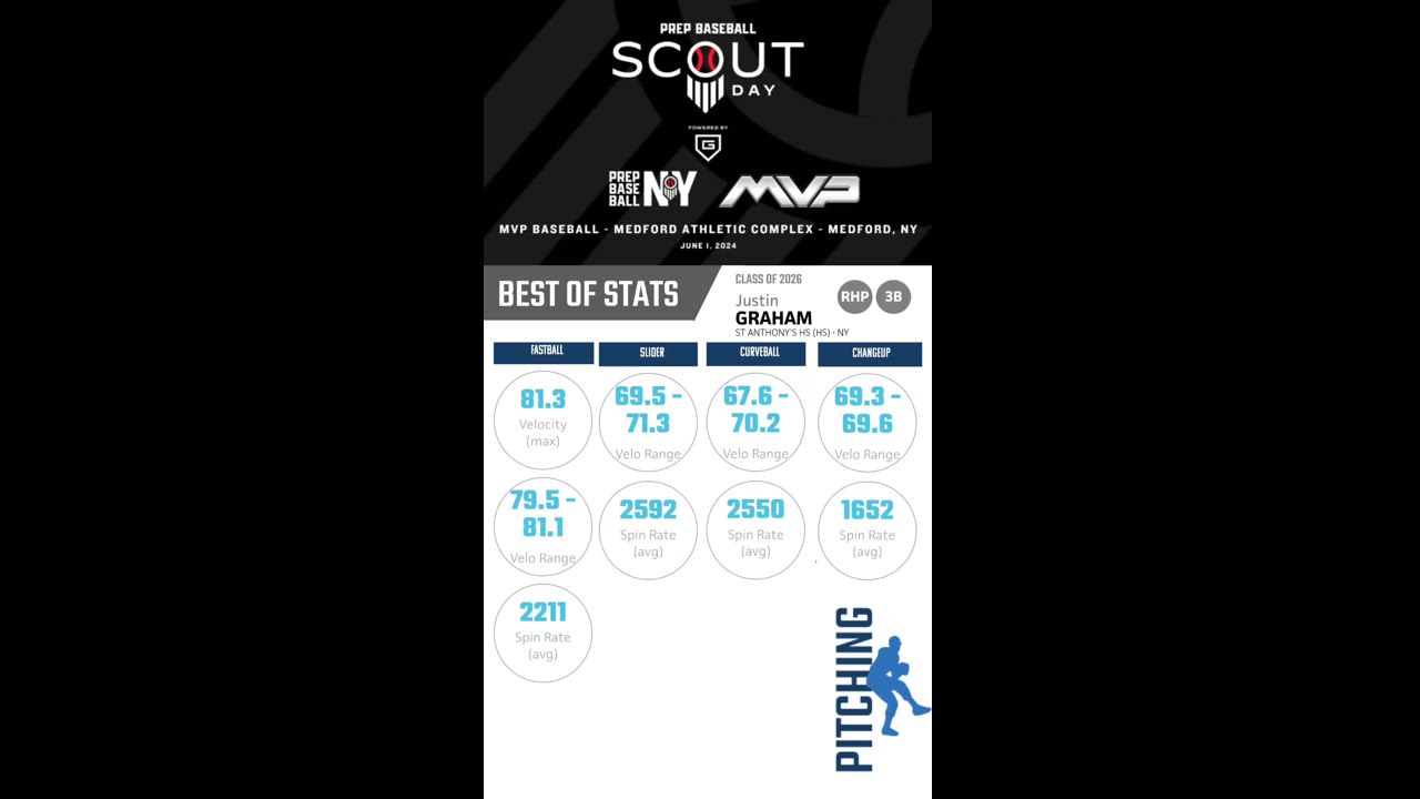 FASTBALL: Velo 81.3, Spin Rate 2211 SLIDER: Velo 71.3, Spin Rate 2592 CURVEBALL: Velo 70.2, Spin Rate 2550 CHANGEUP: Velo 69.6, Spin Rate 1652
