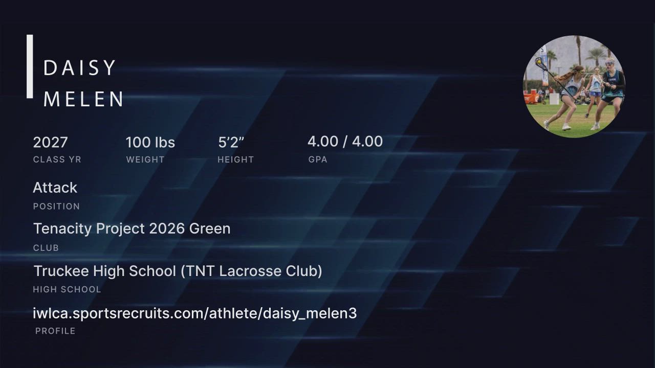 Highlights of my 2024 high school season (TNT Lacrosse): Leading team scorer with 47 goals and 35 assists, Team Rookie of the Year, 1st Team Attack Northern Nevada.