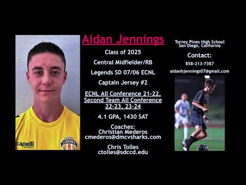 Aidan Jennings Class of 2025 Central Midfielder/RB Legends SD 07/06 ECNL, Jersey #2 ECNL Southwest Conference First Team 21-22 ECNL Southwest Conference Second Team 22-23, 23-24 4.1 GPA, 1430 SAT Torrey Pines High School, San Diego, California Contact: aidanhjennings07@gmail.com 858-213-7387 Instagram: aidanjenningssoccer