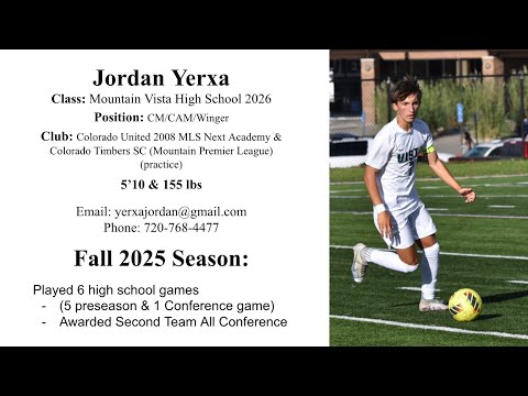 Jordan Yerxa Senior Year Fall 2025 highlights Colorado United u19 MLS Next Academy 6 high-school games played -5 preseason -1 conference -Finished Mountain Vista top scorer (3 Goals, 1 Assist) -Awarded Second Team All-Conference