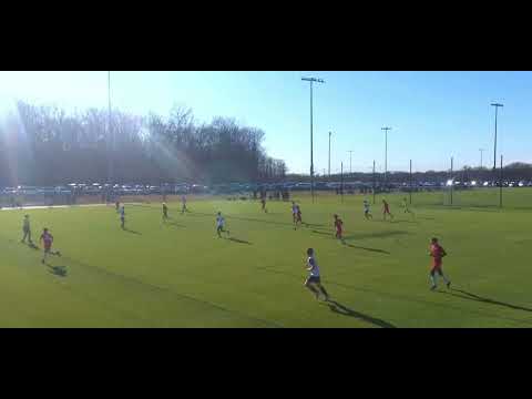 First play, Dax tries to settle goal kick but it goes toward defender, fights to win it back and find teammate. Second play, receives pass from teammate with defender on back and another defender to his side, cuts between the defenders to find space and play it to teammate for attack. Third play, settles ball from keeper out of the air, cuts past defender toward wing, plays winger up the line.