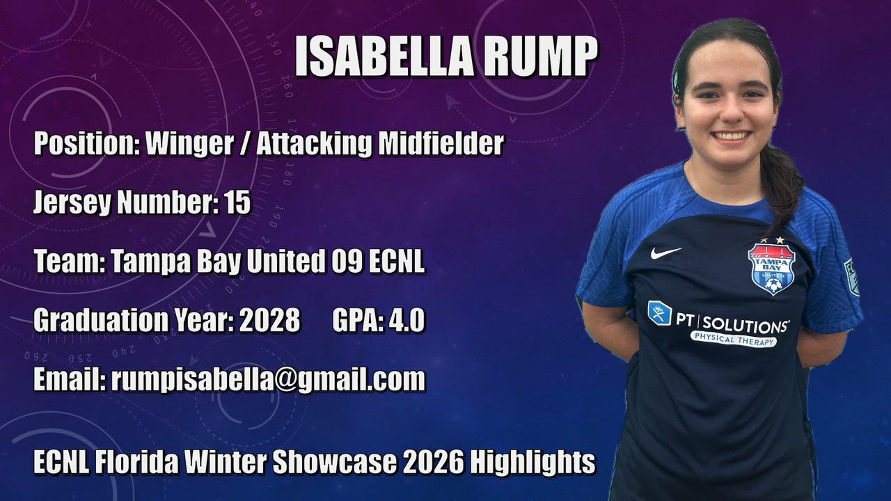 Isa Rump (#15) is a dynamic winger from the Tampa Bay United ECNL 09 team (Class of 2028) who consistently creates attacking opportunities with her speed, technical ability, and attacking instincts. At the ECNL Florida Winter Showcase 2026, Isa demonstrated her ability to impact the game in multiple ways—beating defenders 1v1, making dangerous runs in behind the defense, and creating scoring chances for herself and her teammates. Isa’s strengths include her pace in wide areas, strong ball control at speed, and her ability to stretch the field and create space in the attacking third. She shows excellent awareness off the ball, timing her runs effectively and positioning herself to exploit defensive gaps. Isa is comfortable attacking defenders directly and contributing to build-up play, while also tracking back defensively and supporting her team in transition. Her versatility, work rate, and attacking mindset make her a constant threat on the wing and a valuable asset in competitive ECNL play.