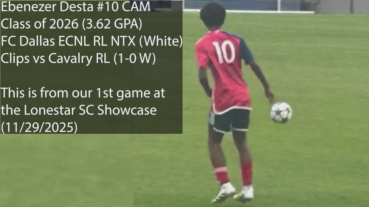 I play for FC Dallas U19 White in the ECNL RL. I play as a CAM, CM, as well as being able to play RW/LW, ST. To contact me: Email: Ebenezer.desta@gmail.com Phone #: 469-829-1525 Instagram: @ebenezer.desta