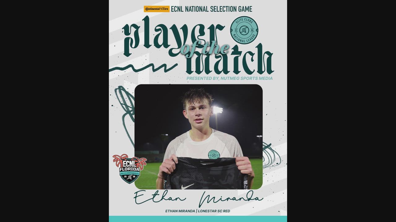Ethan Miranda earned Player of the Match honors at the ECNL Florida National Selection Game in Lake Park, Florida, delivering a standout performance against some of the top ECNL talent from across the country. Representing Team West (white jersey) and wearing #35, Ethan showcased his vision, composure, and ability to control the tempo of the game from midfield, contributing on both sides of the ball and creating key scoring opportunities. The match was called by veteran broadcaster Dean Linke, the longtime soccer play-by-play voice for the Big Ten Network, adding to the special atmosphere of this national showcase event.