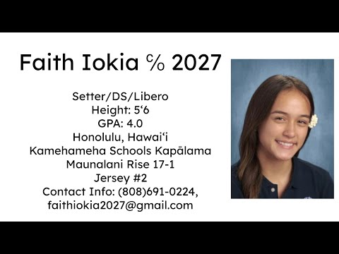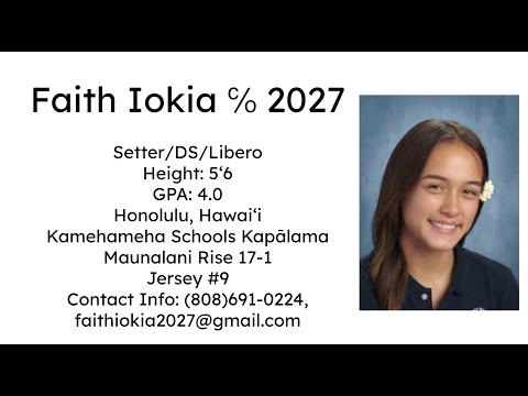 Setter/DS/Libero Height: 5ʻ6 GPA: 4.0 Jersey #2 Honolulu, Hawaiʻi Kamehameha Schools Maunalani Rise 17-1 Contact Info: (808)691-0224, faithiokia2027@gmail.com