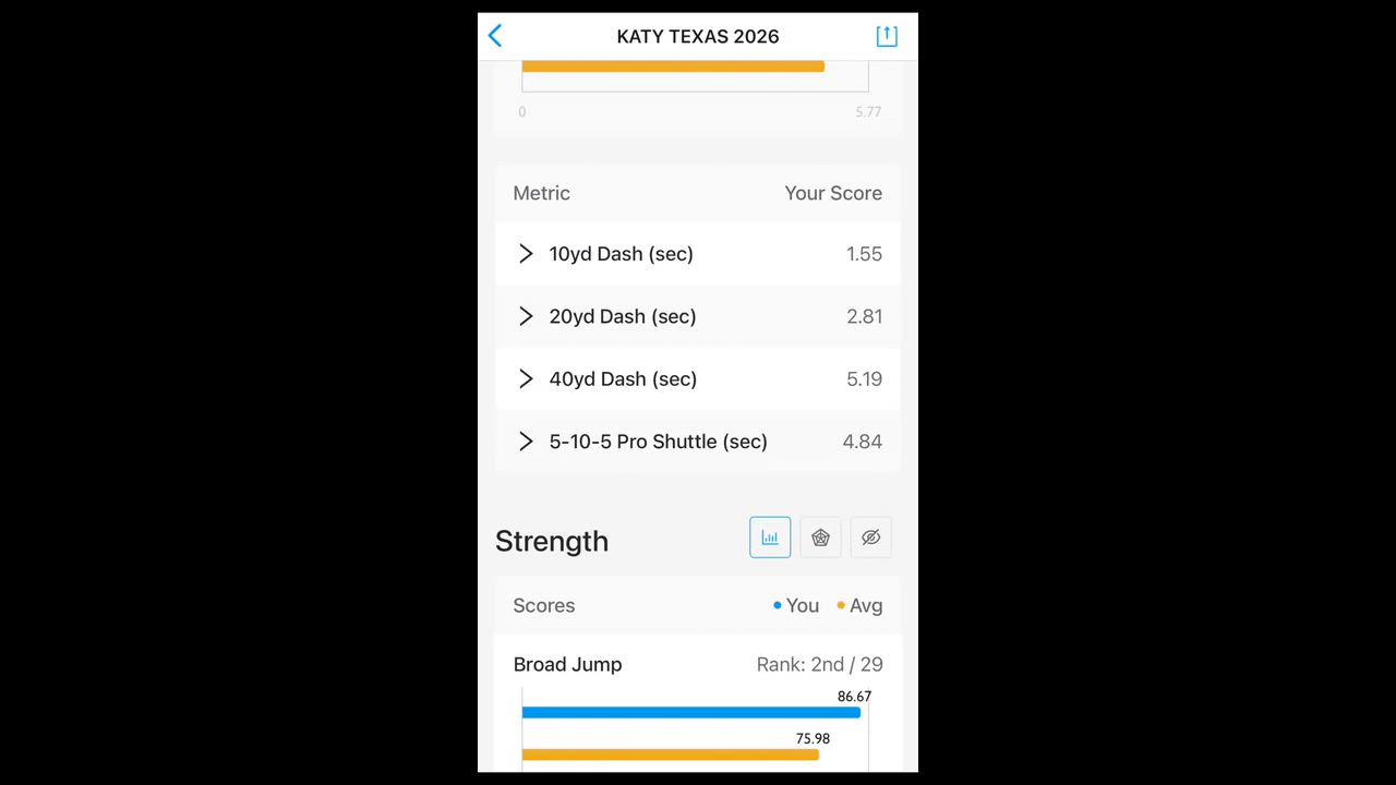 10 yd – 1.55 20 yd – 2.81 40 yd – 5.19 5-10-5 Shuttle – 4.84 Broad Jump – 86.67