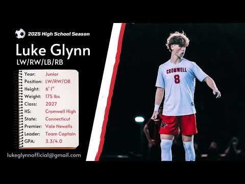 Liam Glynn, Build out and attacking with purpose - composed in build-out and transition - Highlights from HS junior season (Fall of 2025) 6'1", 185 lb center back, Class of 2027 (Cromwell HS & Vale SC). Varsity every year; starter sophomore and junior year (including All Conference honors junior year), invited to and played for Men's U23 Summer Sporting CT team as 16-year old rising Junior (summer of 2025). Strong, physical defender with pace to match runs and recover in transition. Confident and effective heading on both ends (precision clearances and set-piece scoring). Skilled on the ball and calm under pressure. Organizes the back line, communicates, and stays composed in high-leverage moments. Strong 1v1 timing and clean distribution with both feet and capable of taking the ball forward having played CDM and outside back previously.