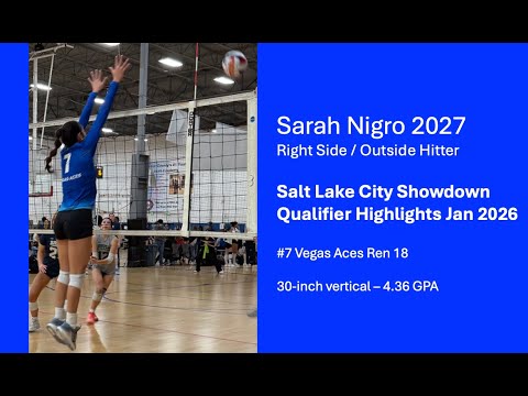 Some highlights with my best blocks and kills from the Salt Lake City Showdown Qualifier Jan 2026. Sarah Nigro, #7 Vegas ACES 19s REN, RS / OH, 30 inch vertical and 4.36 GPA.